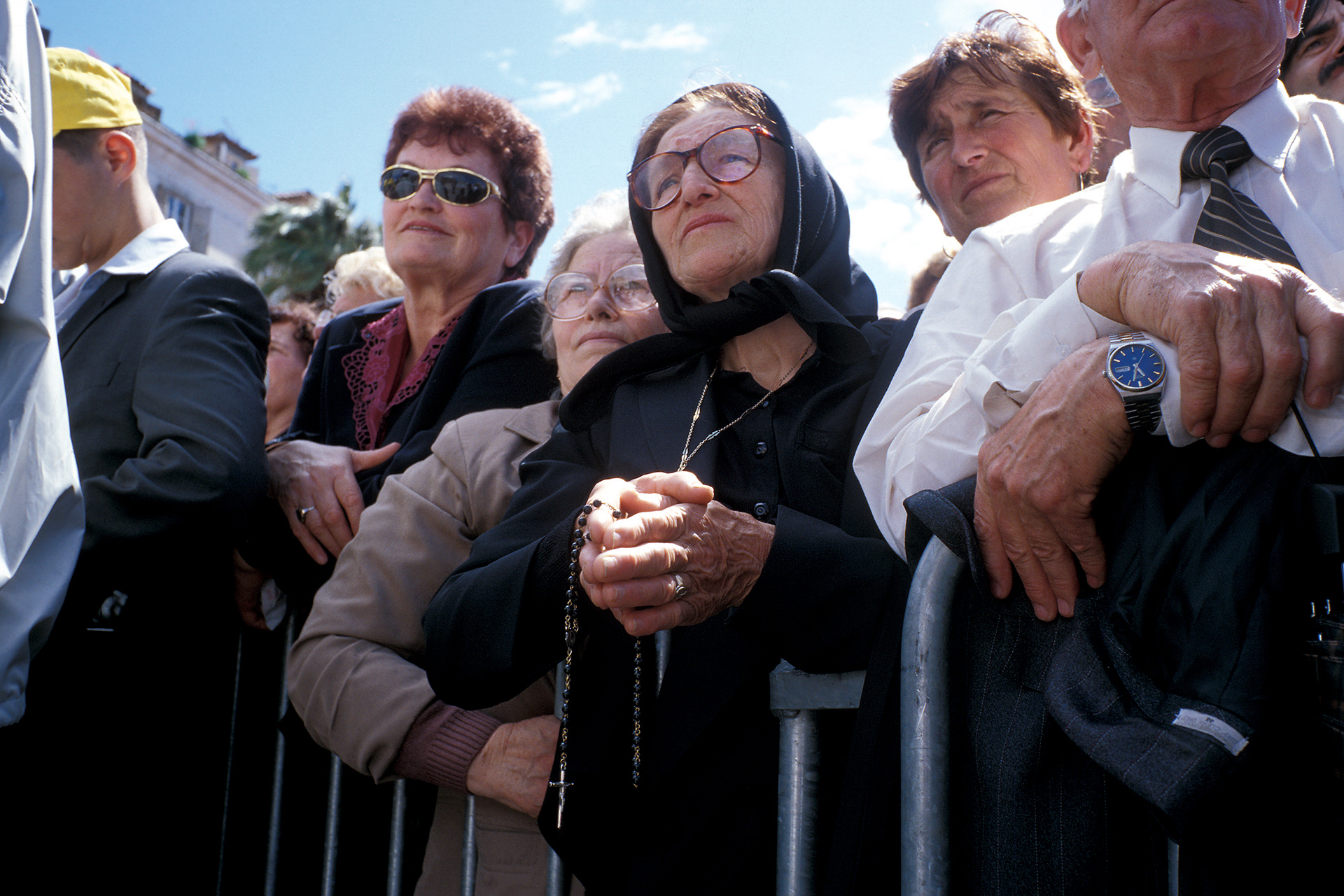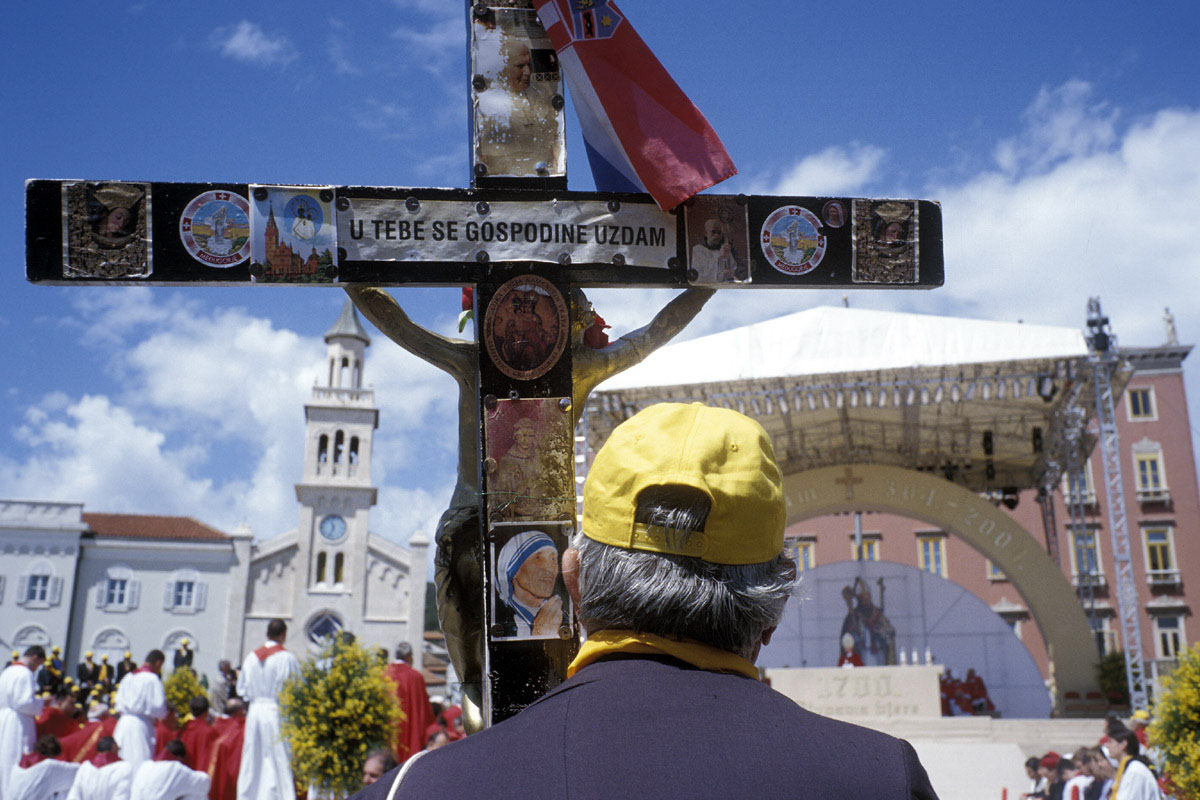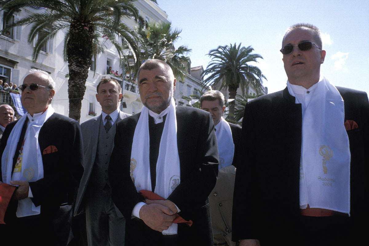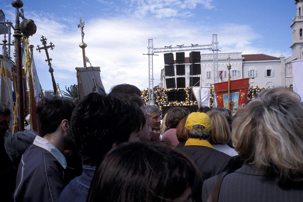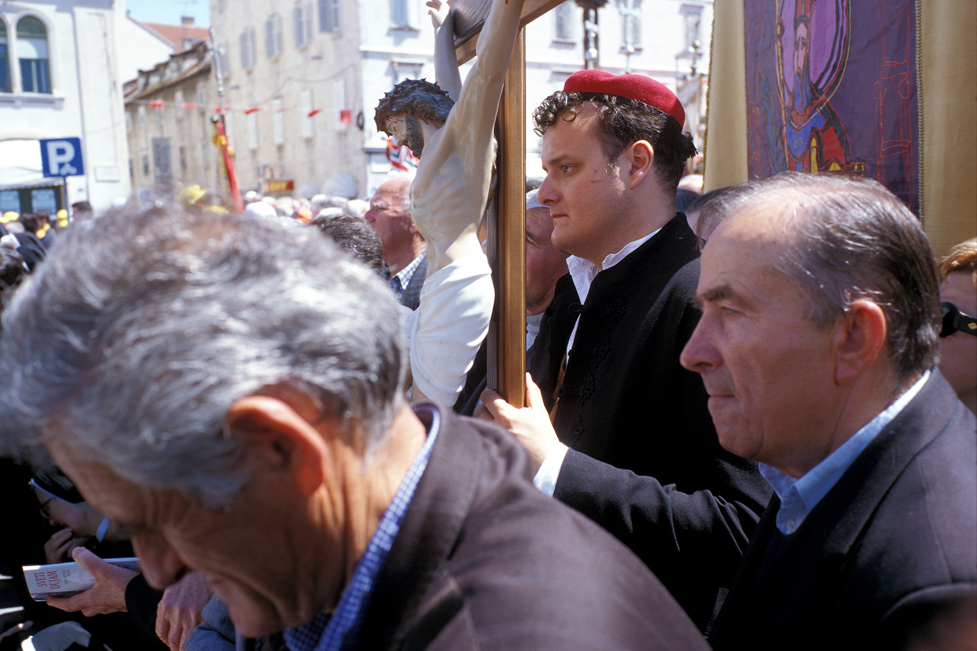 DIEU GARDE LA CROATIE Procession de saint Domnio à Split – Croatie – 7 mai 2004. Le 7 mai, jour de la fête de Split, est dédié au saint patron de la ville, Domnio, ou Dujam, qui fut martyrisé par l’empereur Dioclétien au tournant du IVe siècle ap. J.-C. De nombreuses festivités accompagnent les deux principales cérémonies religieuses : une procession menée par les plus hauts dignitaires de l’Eglise et du gouvernement, puis une grand messe. Interdite sous l’ère socialiste, cette grande fête populaire – la plus importante de la Dalmatie – fut restaurée en grandes pompes en 1990, dans un climat de montée en force de la religion catholique et du nationalisme croate. Après la guerre de Croatie (1990-1995), l’Eglise est perçue par le peuple comme garante de l’identité nationale croate, et joue un rôle clé dans le climat d’épuration qui marque cette période. Tandis que la Commission Européenne conditionne l’adhésion de la Croatie à l’Europe à la livraison des criminels de guerre au Tribunal Pénal International, le gouvernement civil s’engage à collaborer, mais les Catholiques font de la fête de saint Domnio une démonstration de nationalisme autant que de ferveur religieuse. Dans ses prêches, le clergé ne cache pas sa réticence à livrer aux institutions internationales des héros de l’armée croate. Les images présentées dans cette série témoignent de cette imbrication des enjeux politiques et religieux.