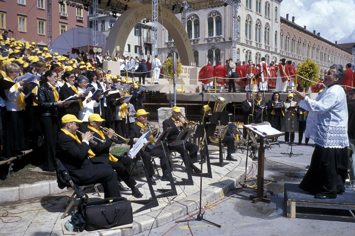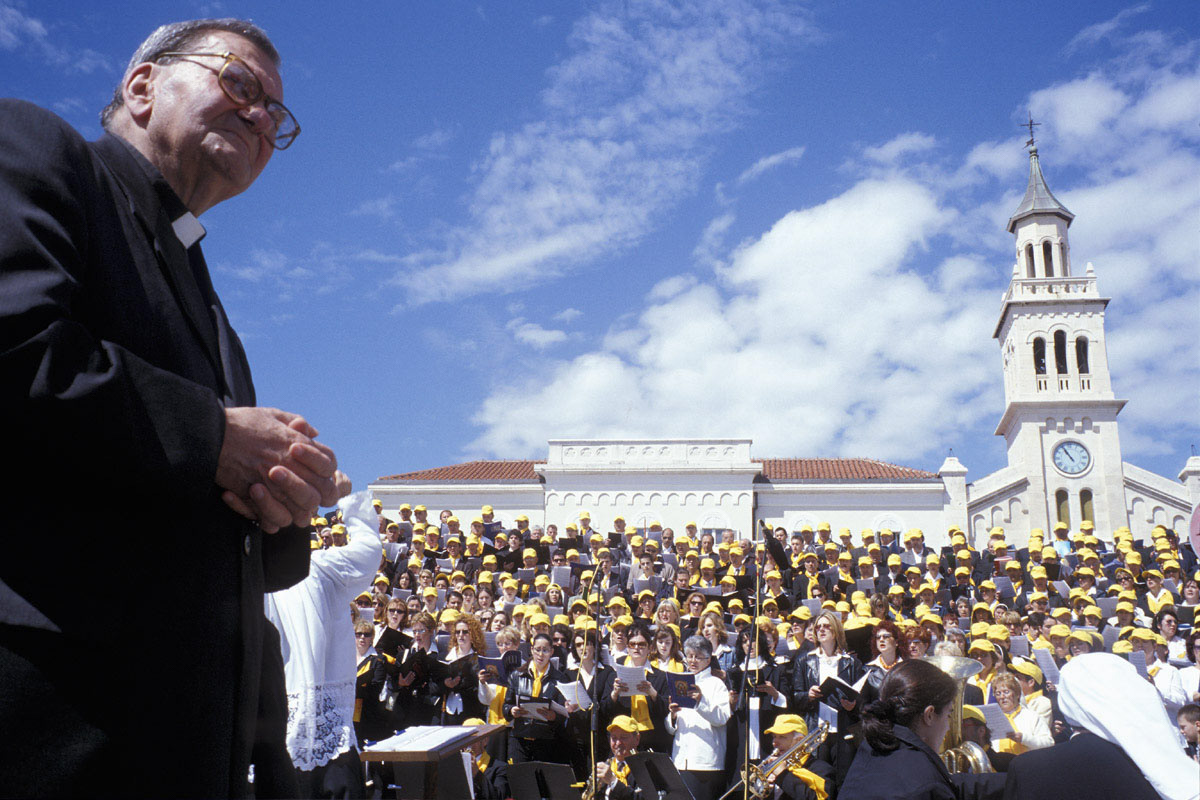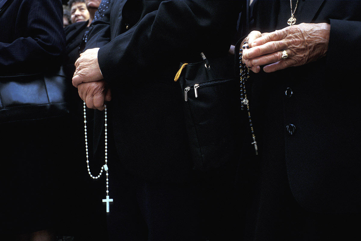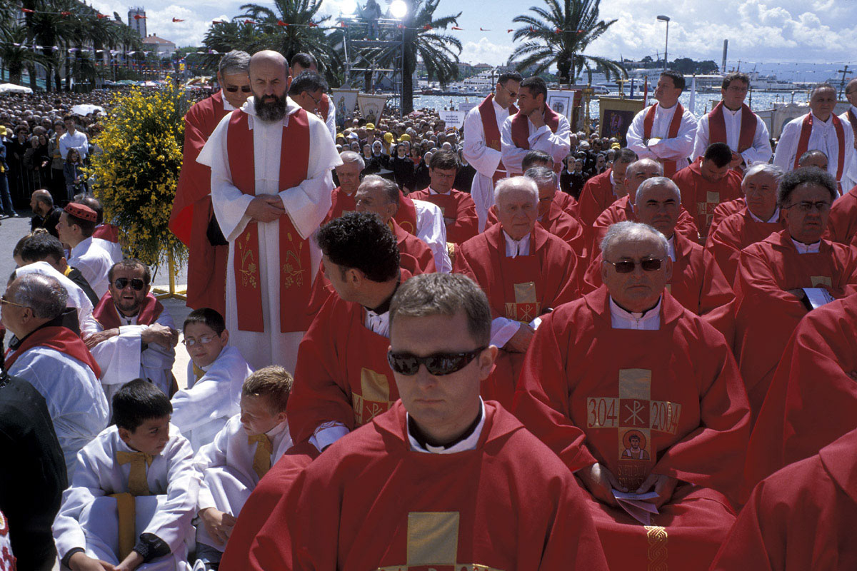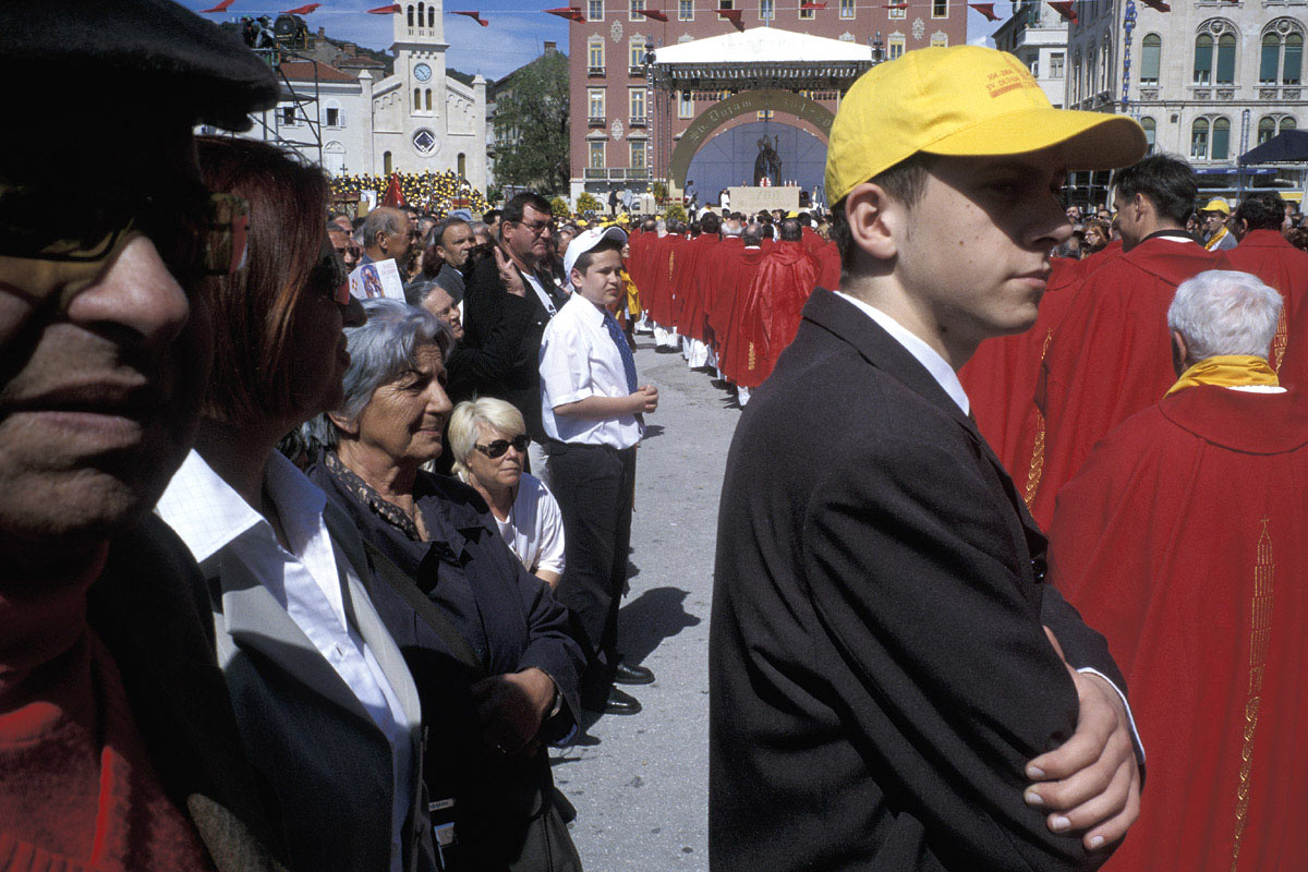 DIEU GARDE LA CROATIE Procession de saint Domnio à Split – Croatie – 7 mai 2004. Le 7 mai, jour de la fête de Split, est dédié au saint patron de la ville, Domnio, ou Dujam, qui fut martyrisé par l’empereur Dioclétien au tournant du IVe siècle ap. J.-C. De nombreuses festivités accompagnent les deux principales cérémonies religieuses : une procession menée par les plus hauts dignitaires de l’Eglise et du gouvernement, puis une grand messe. Interdite sous l’ère socialiste, cette grande fête populaire – la plus importante de la Dalmatie – fut restaurée en grandes pompes en 1990, dans un climat de montée en force de la religion catholique et du nationalisme croate. Après la guerre de Croatie (1990-1995), l’Eglise est perçue par le peuple comme garante de l’identité nationale croate, et joue un rôle clé dans le climat d’épuration qui marque cette période. Tandis que la Commission Européenne conditionne l’adhésion de la Croatie à l’Europe à la livraison des criminels de guerre au Tribunal Pénal International, le gouvernement civil s’engage à collaborer, mais les Catholiques font de la fête de saint Domnio une démonstration de nationalisme autant que de ferveur religieuse. Dans ses prêches, le clergé ne cache pas sa réticence à livrer aux institutions internationales des héros de l’armée croate. Les images présentées dans cette série témoignent de cette imbrication des enjeux politiques et religieux.