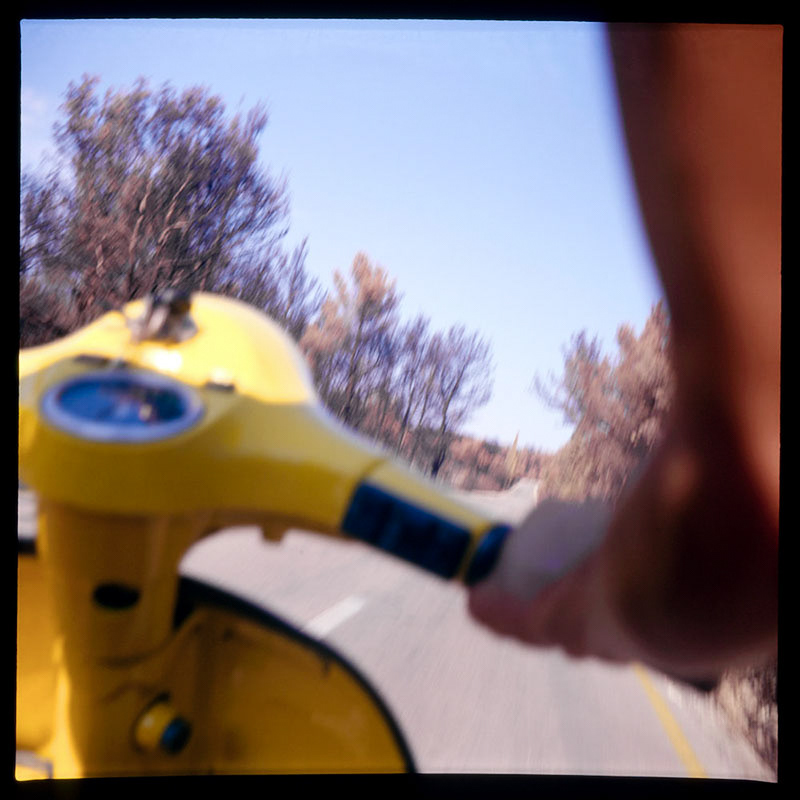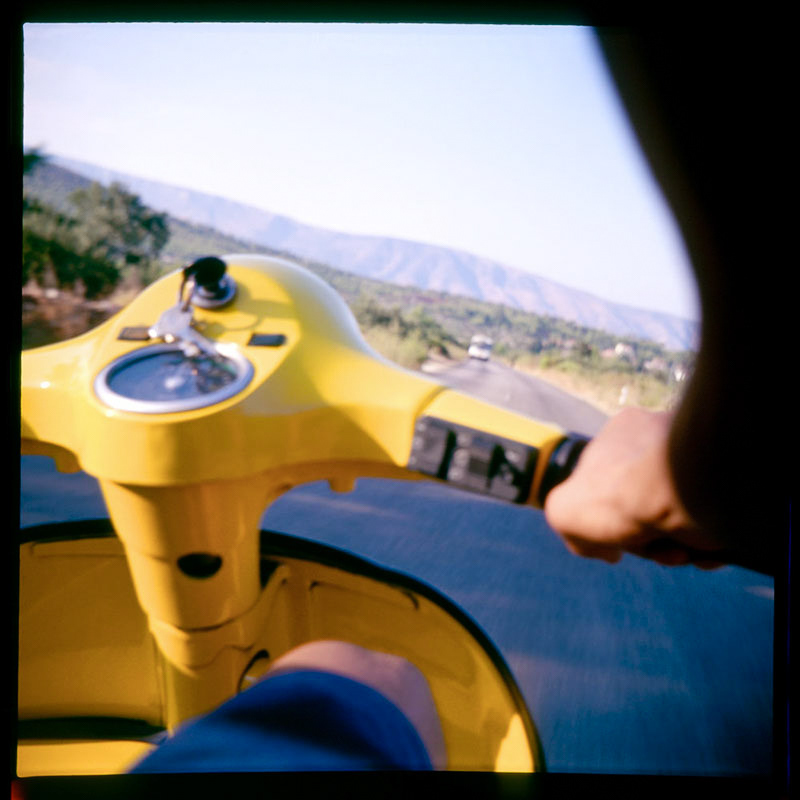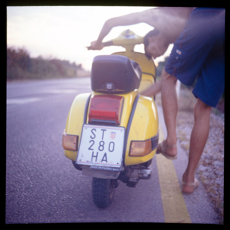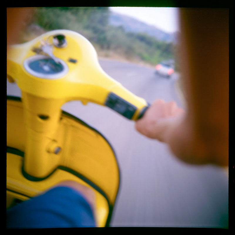 LA VESPA JAUNE 2003 Traversée de l’île de Hvar, en Croatie, sur le siège arrière de la Vespa jaune de mon ami Davorin. Course furieuse ponctuée de pannes impromptues On ne sait pas où l’on va, mais on y va ! Pour le plaisir de sentir le sifflement du vent se mêler au doux ronronnement de la Vespa. Les déclenchements saccadés de mon Rolleiflex se font au rythme frénétique du moteur deux temps. Une lumière estivale nous brûle les yeux. La dolce vita couleur croate.